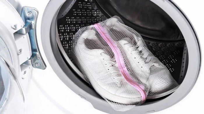 For å trygt vaske sko som tåler vann, bør du først vaske sålen fra små steiner og sand for å unngå tilstopping av filteret. I tillegg må du sørge for å fjerne snørebåndene og innleggssålene, som er bedre å oppdatere separat, og plassere selve skoene i en spesiell beskyttelsespose.